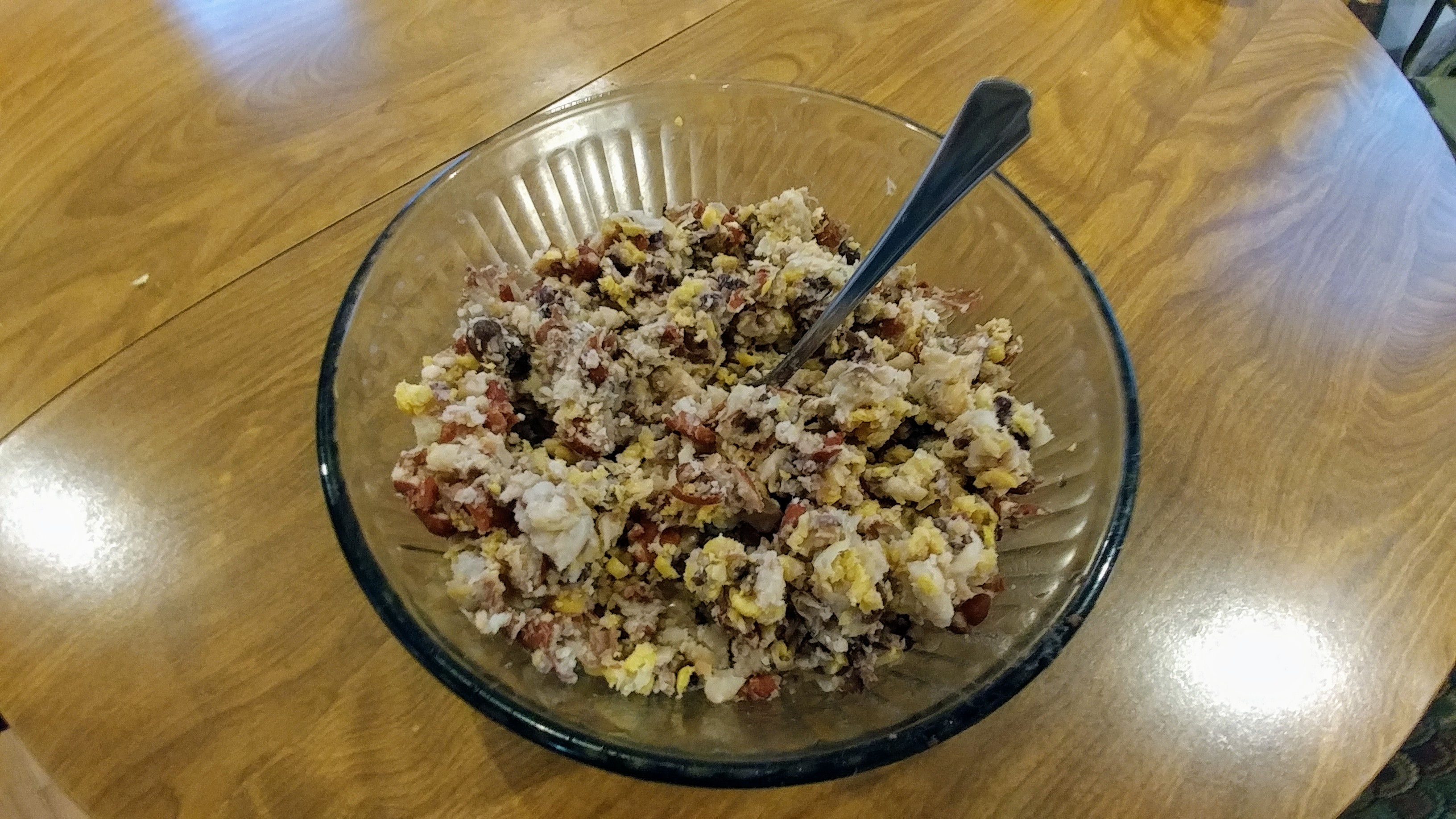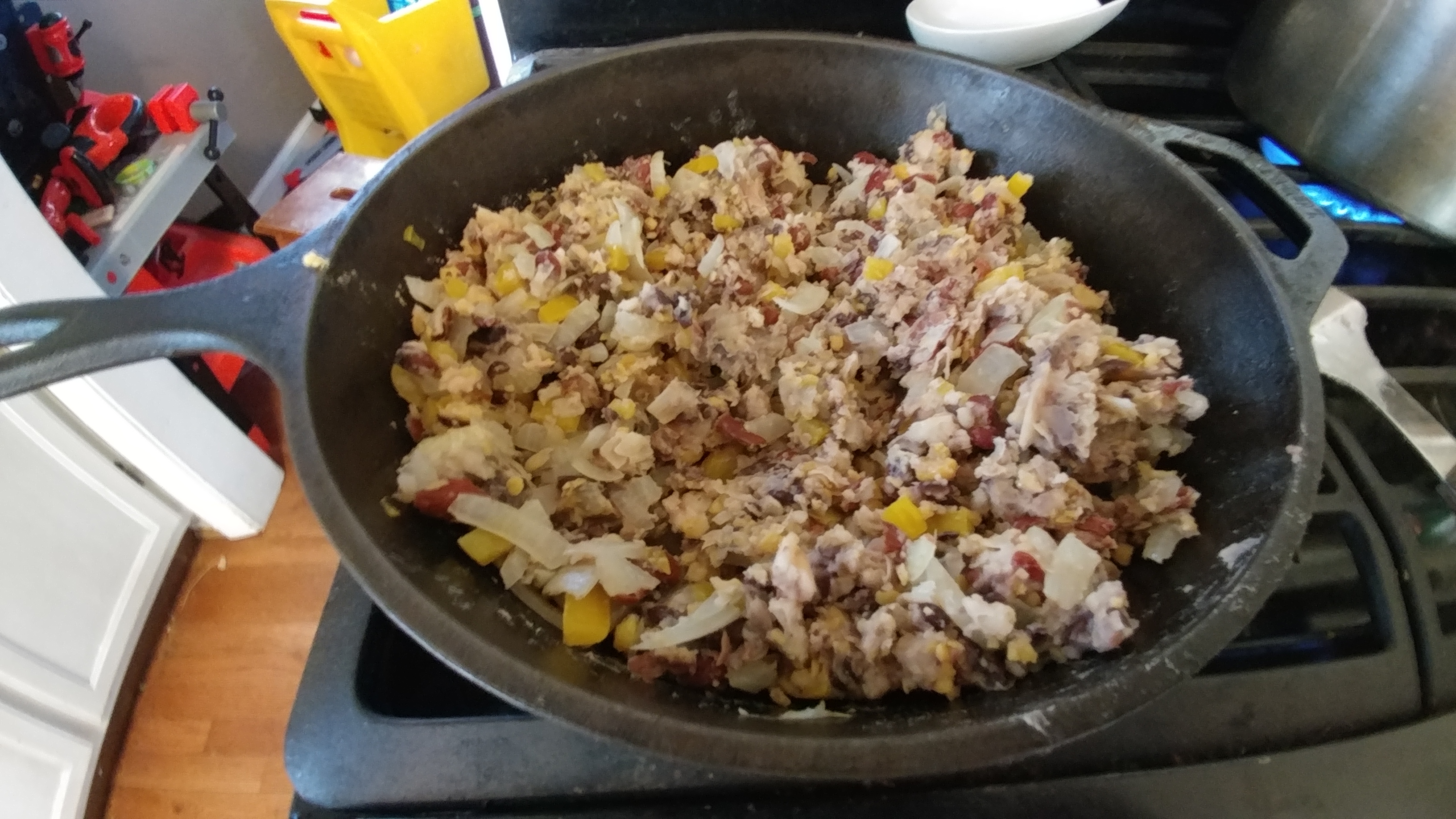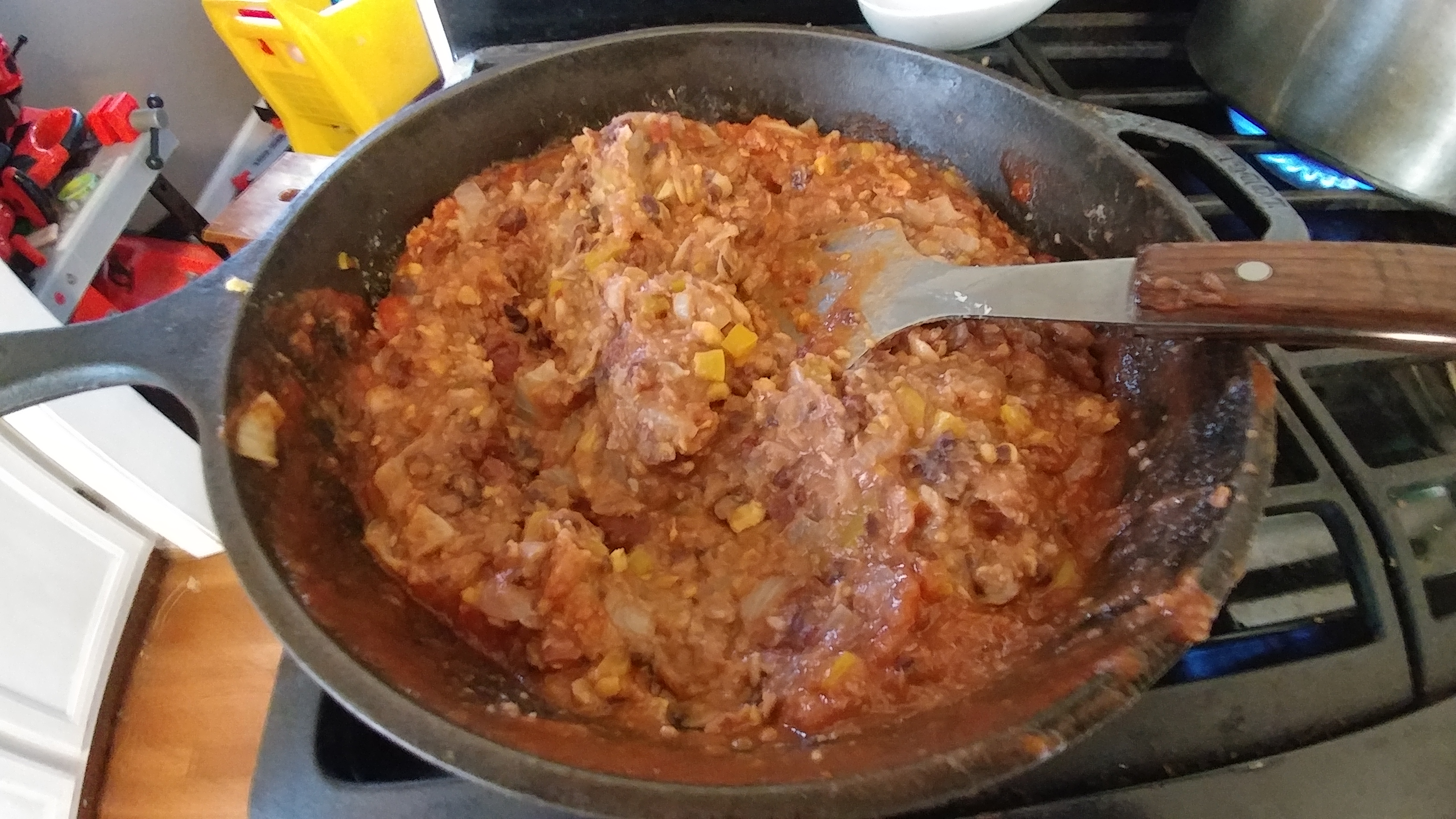 This is the annoying part. I have a small kitchen and so I cannot store many gadgets. I do a lot of prep work with a cutting board and knife. In this instance, it is a fork. If you have a food processor, you may be able to use it to mash the beans, but I don’t know if it is going to gum up your machine. Regardless, you CAN make this dish without any special equipment.