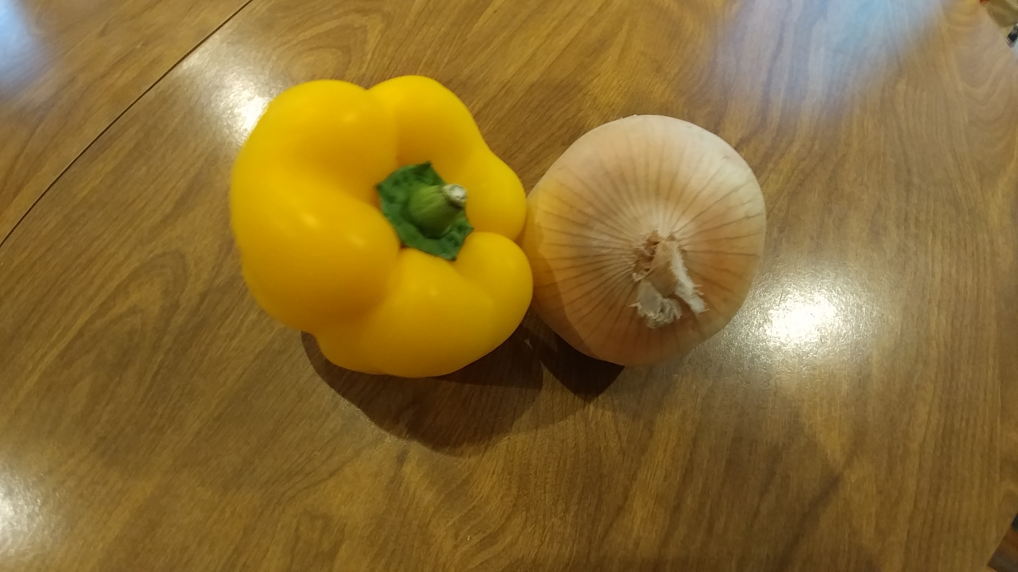 - Heat olive oil in pan on medium high heat. Add diced onion and bell pepper to pan. Cook for about 5 minutes, stirring to prevent burning.