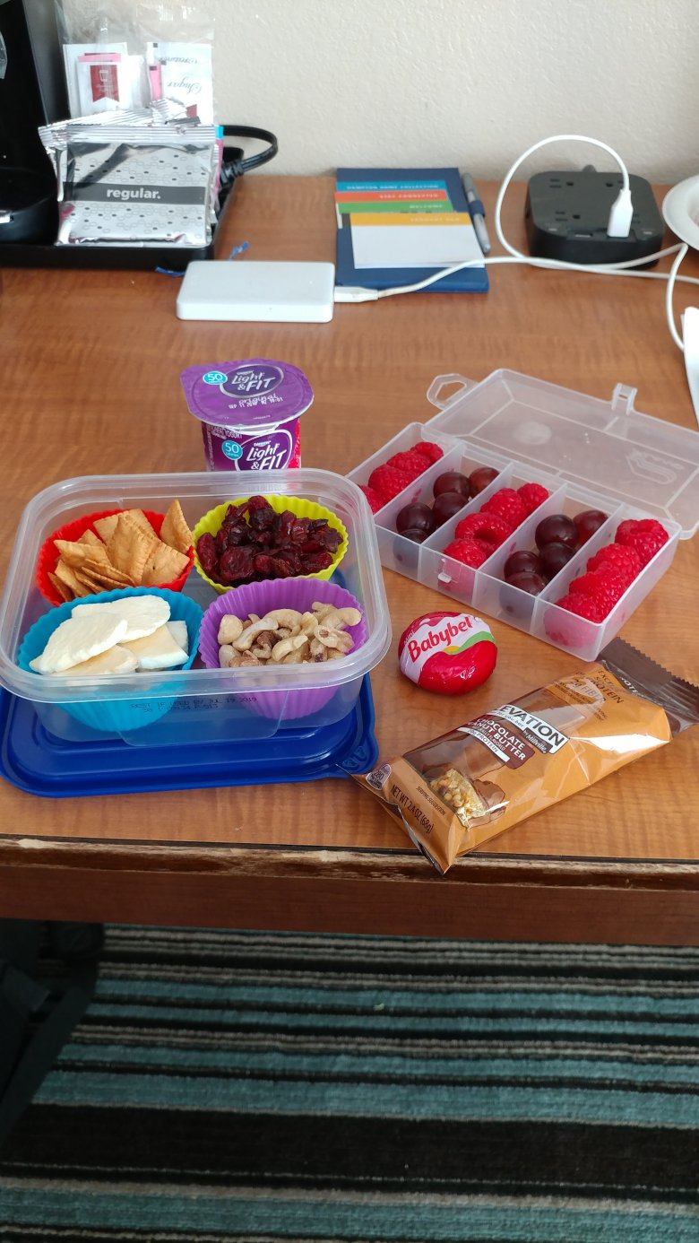 Eating out is expensive, I don’t care who is footing the bill. And only my husband’s meals are covered, so I make sure to keep the bills down by grocery shopping in the area. I pack most lunches and cook most dinners. It works out well because our meals are slightly healthier than what you would find eating out.
