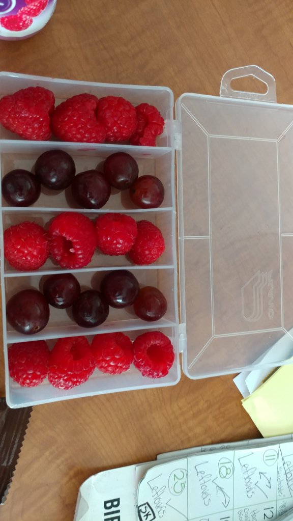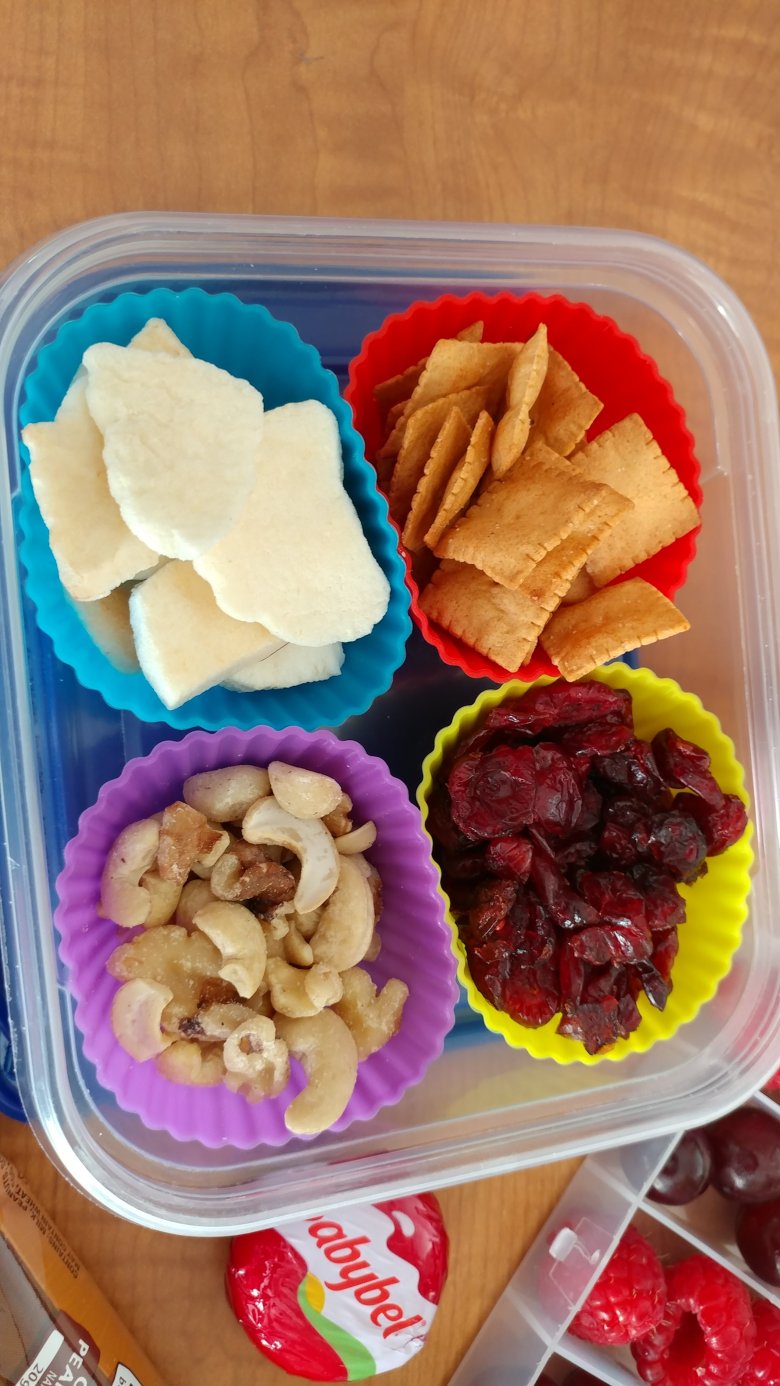 The tackle box is a nod to me and my outdoor ways (as is the wood grain water bottle – purple is my husband’s favorite color). The silicone baking cups can be used to keep dry food separated, if placed in another container. It is pleasing to the eye and fun to create.
