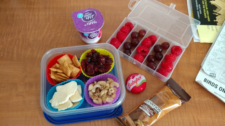The tackle box easily houses fruit, nuts, cheeses, a meat stick or pretzels.