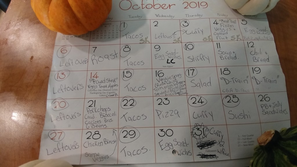But then what is this Egg Sandwiches and Peanut Butter and Jelly Sandwiches that keep coming up on the calendar? That is not big cooking! That isn’t even prepping! It’s more like a like a weak attempt at getting sustenance while being hung over! Yeah I get it. Let me explain…