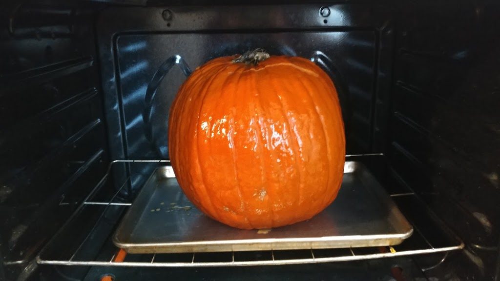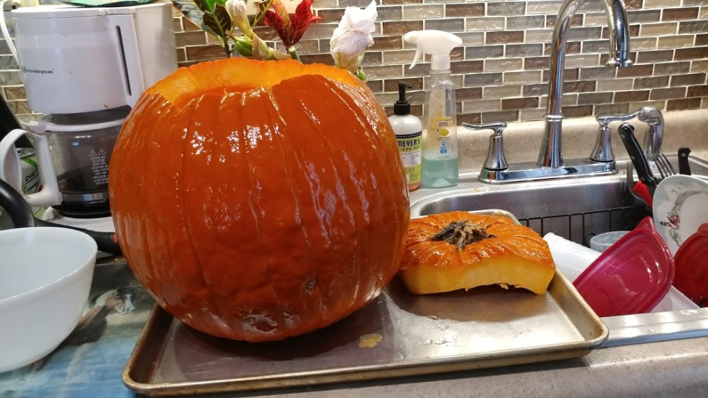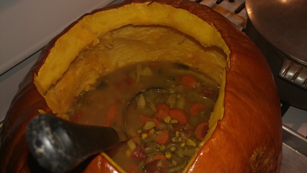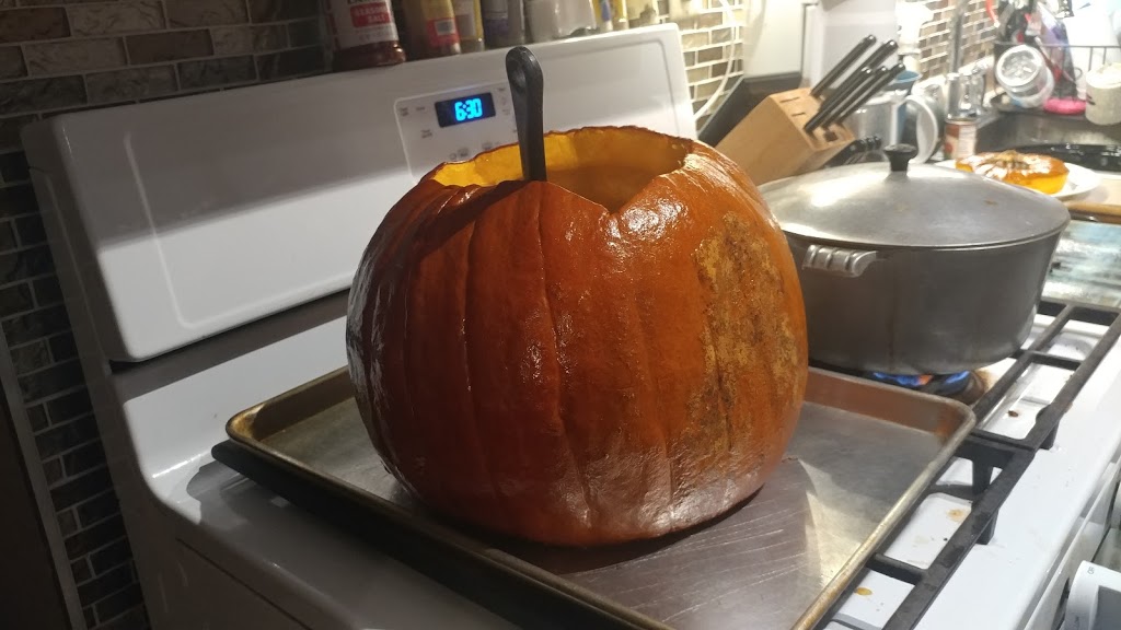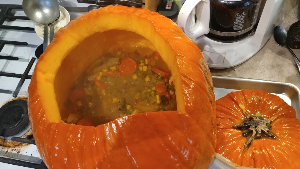 1 Large Pumpkin, cleaned out and insides scraped. (Seeds saved for baking later).