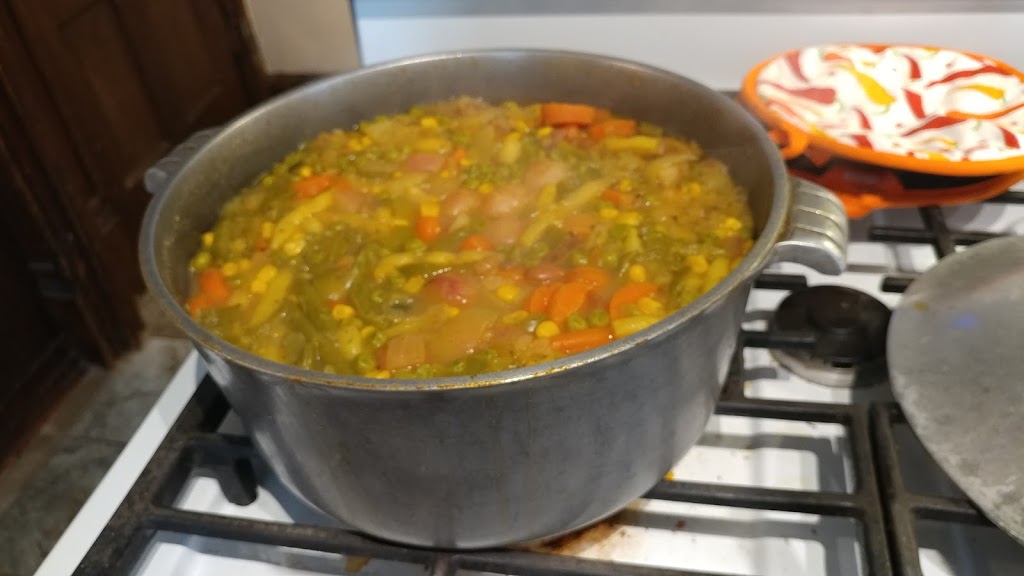 2. I put all of my veggies, beans, seasonings and vegetable broth in a pot. I covered and brought it to a boil. I turned it down to a slow bubble and cooked it for 1.5 hours.