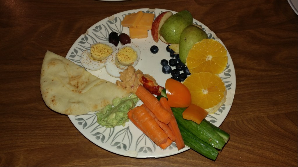Olives, chunk cheese, sliced apples, pears and oranges, blueberries, bell peppers, cucumbers, carrots, hummus and avocado spread (avocado and garlic salt, mashed up and made at home!) naan bread, and hard boiled eggs with seasoning salt. It was so good! My husband enjoyed it and my daughter exclaimed she had a “rainbow plate!”