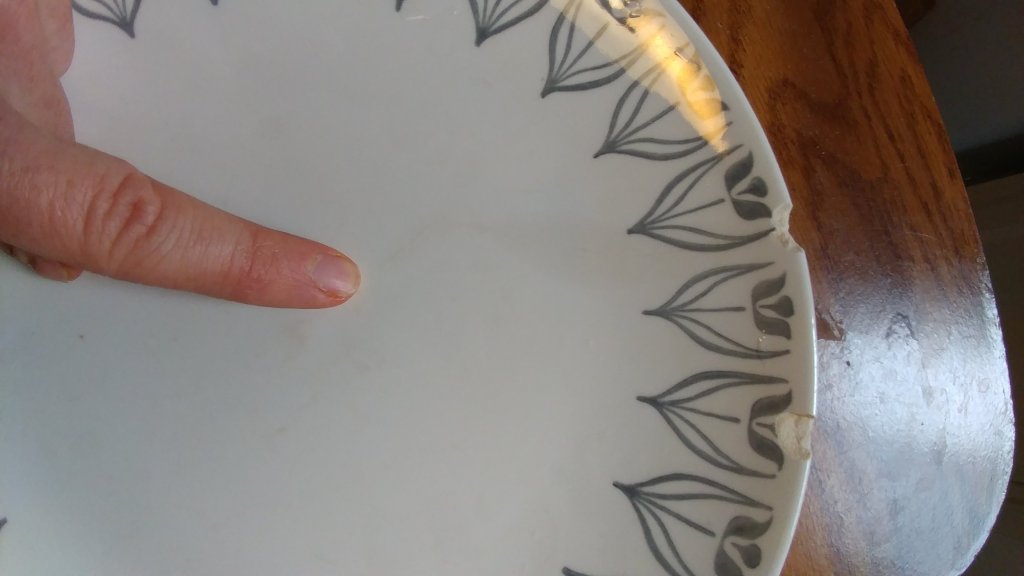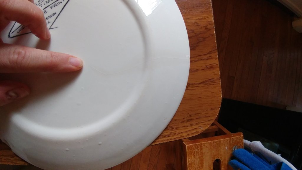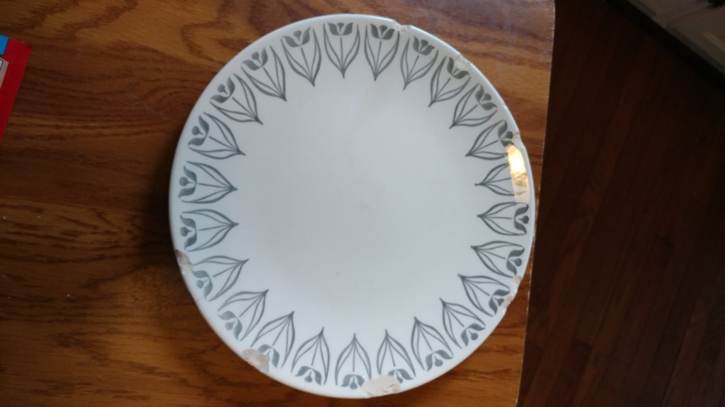 My favorite dinner plate is finally broken beyond use. It is chipped up badly, front and back, which made it MY telltale plate. I loved this plate because it would not stop working.