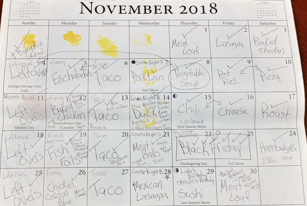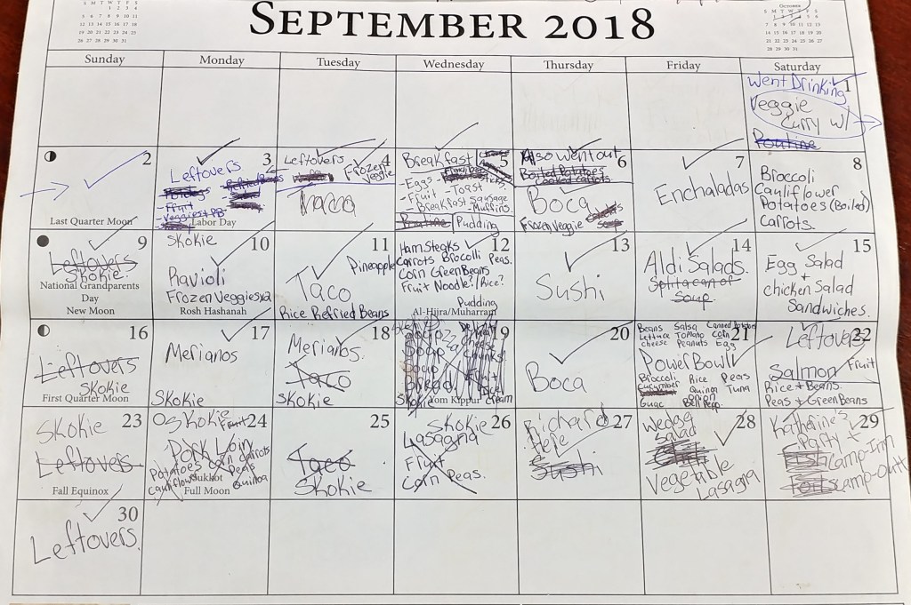 Our house was still under construction into August.  It was getting old.  We were all missing game night so some of our guests hosted two of the weeks.  We really appreciated it.  (1st and 8th).  I love how on the 4th we just gave up and escaped to Door County, Wisconsin for a day.  I pushed the ham steaks I was supposed to cook on the 4th off to the 6th, pushing chili to the 10th, but not actually cooking it because of the heat.  We had plans for the 16th, but those changed last minute, so we went to Qdoba for dinner, our 7year “dating anniversary”.