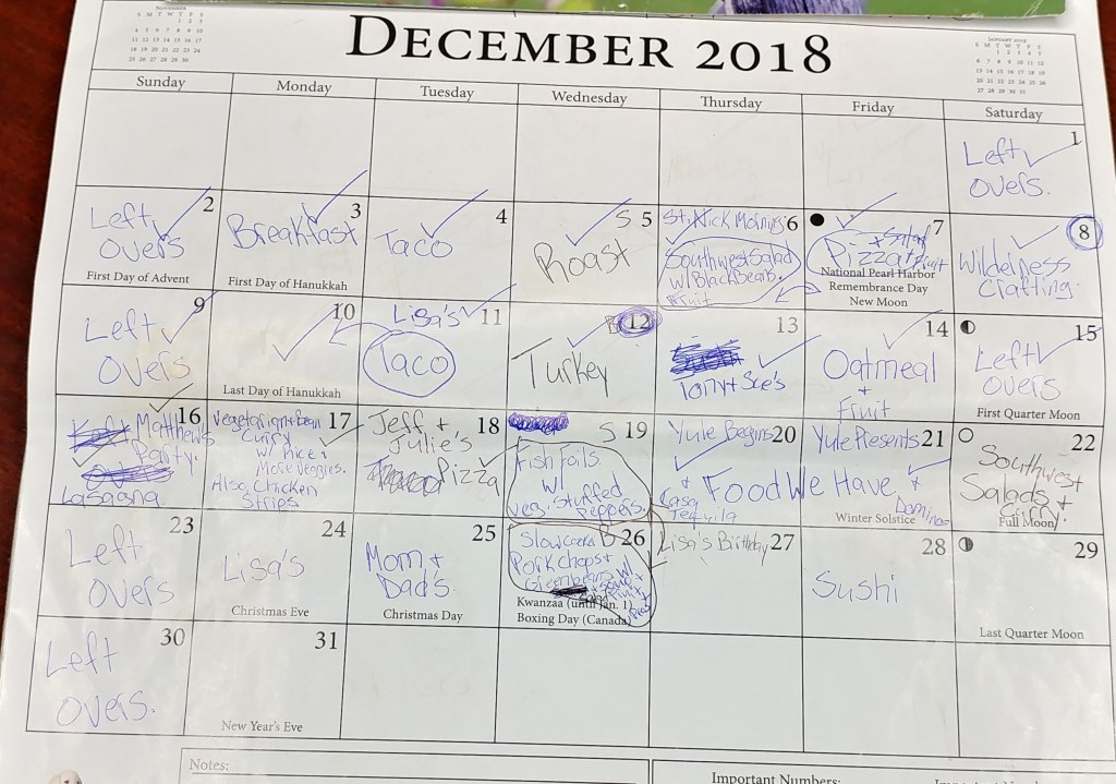 Yule for us is a two-day event, starting the evening of the first night with Boast and Brag and ending with presents the next day, as Santa came overnight.  Boast and Brag is basically New Years – talking about the prior year, bragging about what you have done, and creating goals for the next year, boasting what you will accomplish.  I usually do not cook these days – or I have something going in the slow cooker so I do not have to worry about it, and I can enjoy Boast and Brag with of course, mead drinking.  It looks like 2018 we went out.
