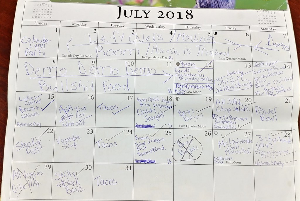 Now to be fair, in January and February of 2018, we took the entry of our house down to studs and built the room back up.  See, Lucas was working at home full time and he needed a real office.  Our house was small.  I suggested making the entry to our house his office.  “Where?!”  Was the response from Luke.  The room was a nice size, two or three people could crowd into it, but it had a small corner closet that took up some space.  I suggested tearing out the closet so that a desk could fit in the room.  The floor needed to be redone, as the previous owners put tile down incorrectly, and the tiles were shattering.  I had a pet rabbit at the time which ate a whole in one of the walls and chewed on the baseboards.  Plus, the room was miserably cold.  It was an add-on to the house, and I figured it was another project that was done incorrectly, and I was ready to put an outside door on an inside door frame to keep the cold in the entry and out of the living room.  But since we were ripping up everything else, we decided to make it a new room.  New floors, new walls, new electrical, new windows, and a set of new entry doors.  It was all broke – time to get something that worked.  We opened the walls up and low and behold, what did we find behind the dry wall?  Solid – huge chunks of ice in our walls.  See, the previous owners hung something up in the ceiling in the entry way.  When we took the nail out, we measured it at about 4 inches.  The nail went through the ceiling drywall and punctured the vapor barrier in the ceiling.  It caused water damage to the ceiling.  We called in a roofing company to fix the roof leak – with basically a blank check – we just wanted the problem solved.  Well, they did some stuff, but never solved the problem.  8 months later, we were unaware, but water was still dripping through the walls but because it was Winter, it all turned to ice.  Our front entry was turned into a literal ice box.  The damage was so great we almost lost the brick work on one of the exterior walls of the house.  We had to tear the roof off that room of the house.  So, the several week construction did slow our healthy meal intake down.  A house in total chaos, dirt everywhere, and construction dust do not make for an ideal environment to prep food in.  Same thing happened in July.  Except we were not doing an entry, we were doing the master bedroom and walk-in closet (which was huge mind you, we were lucky).