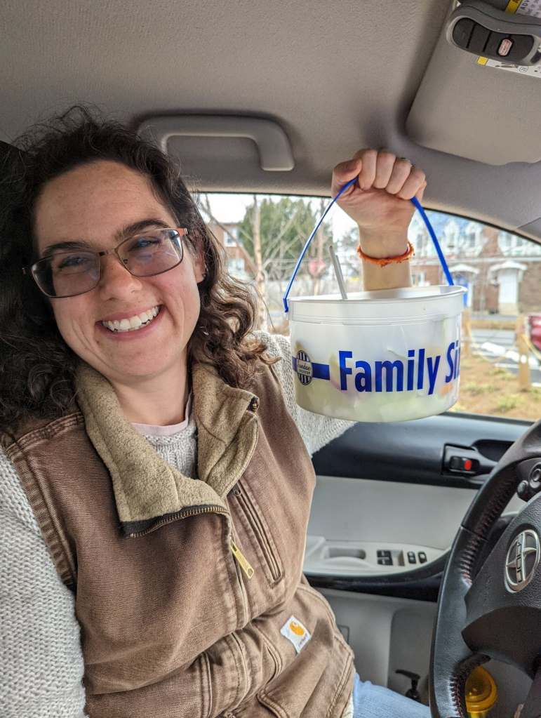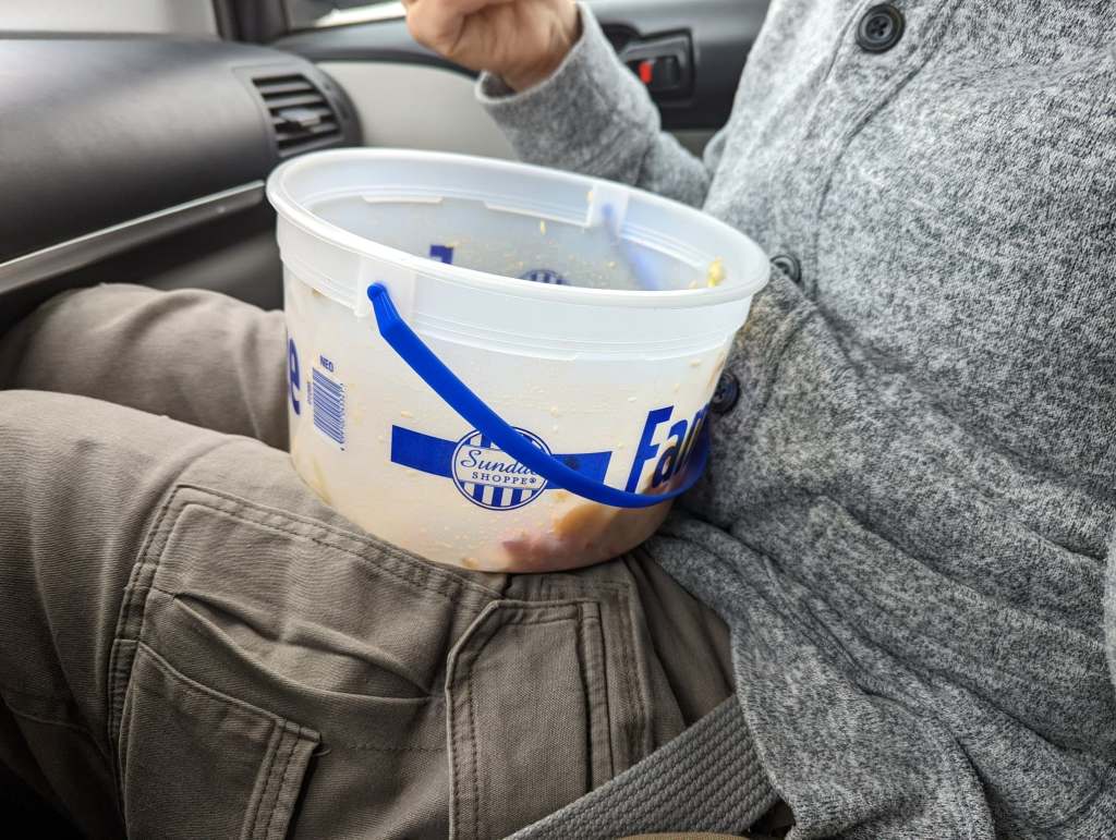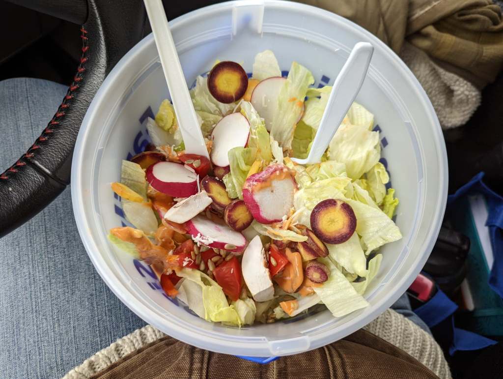 No shame! We were visible in our tiny little Scion IQ – people stare at the car on a normal basis, but now the driver is just eating out of a family size ice cream pail with a single serve utensil? Yep! I knew I looked ridiculous, but I didn’t care! My salad was only 350 calories! Guaranteed! I weighed it! And it came at a cheap price – since I put in the work prepping it. We were sticking to our goals!
