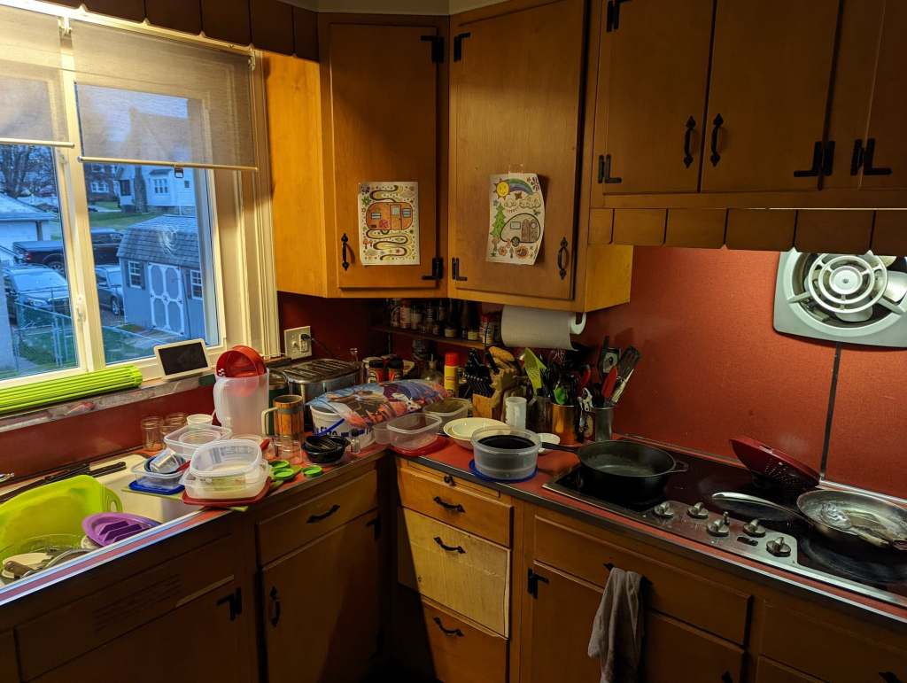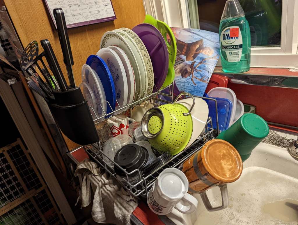 Mess mess mess. My kitchen requires my attention every night. I always have dishes – they are unavoidable – especially when we pack a lunch to go! So many more containers.