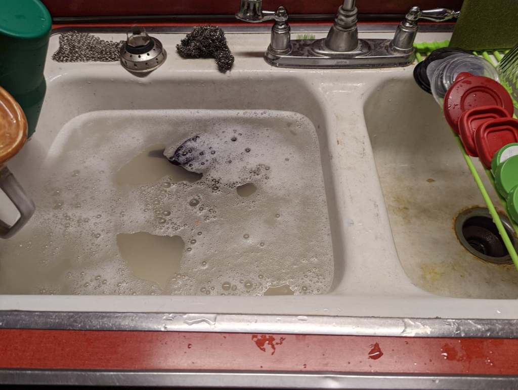 This is the amount of water I used (plus a pitcher of water to dump down the other side of the sink) to do all of these dishes.