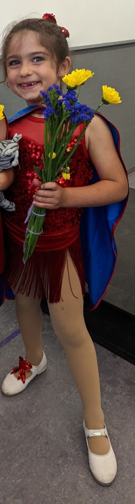 That weekend Catawba-Lynn had her dance rehearsal and recital. I volunteered to be the backstage dance mom or Catawba’s class. I didn’t realize that Tawbs liked or cared that I stay in the basement during dance or that I am present during classes and such – but she is very proud that I am lurking near. She was very excited I was the backstage mom. I had to entertain the girls in between dances, help them in the bathroom, help them into their costumes and just keep track of them. They did great. I was so proud of Tawbs. I wouldn’t have picked out her costume to wear, but I understand it is dance, so it is what it is. But they looked real sweet. She loved it. I bought flowers for all of the girls in her class and she gave them their flowers after the whole performance. Tawbs has asked me repeatedly to be that again for the classes she dances in during her recital.