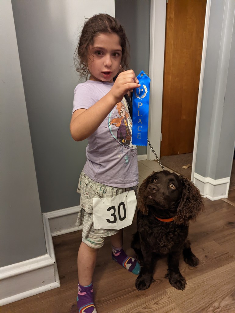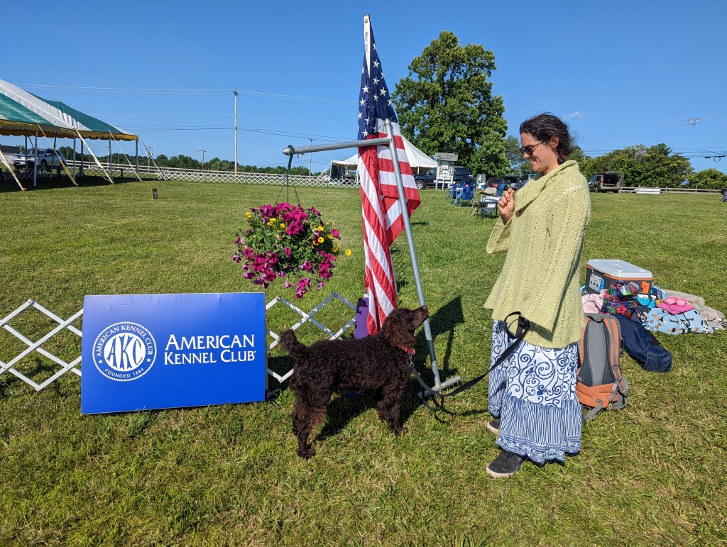 We had our second show in June. We went to the Bryn Mawr dog show held in the horse arena. We didn’t show well, but both days we had very good judges who were understanding that Sessrumnir was young, and I was new. Both judges, both days, tried giving me a ribbon, even though I didn’t qualify for them, and they also excitedly told me I could show in the owner-handler show – and then they had to take it back. That made me feel good though – the judges were happy to see the American Water Spaniel out showing.